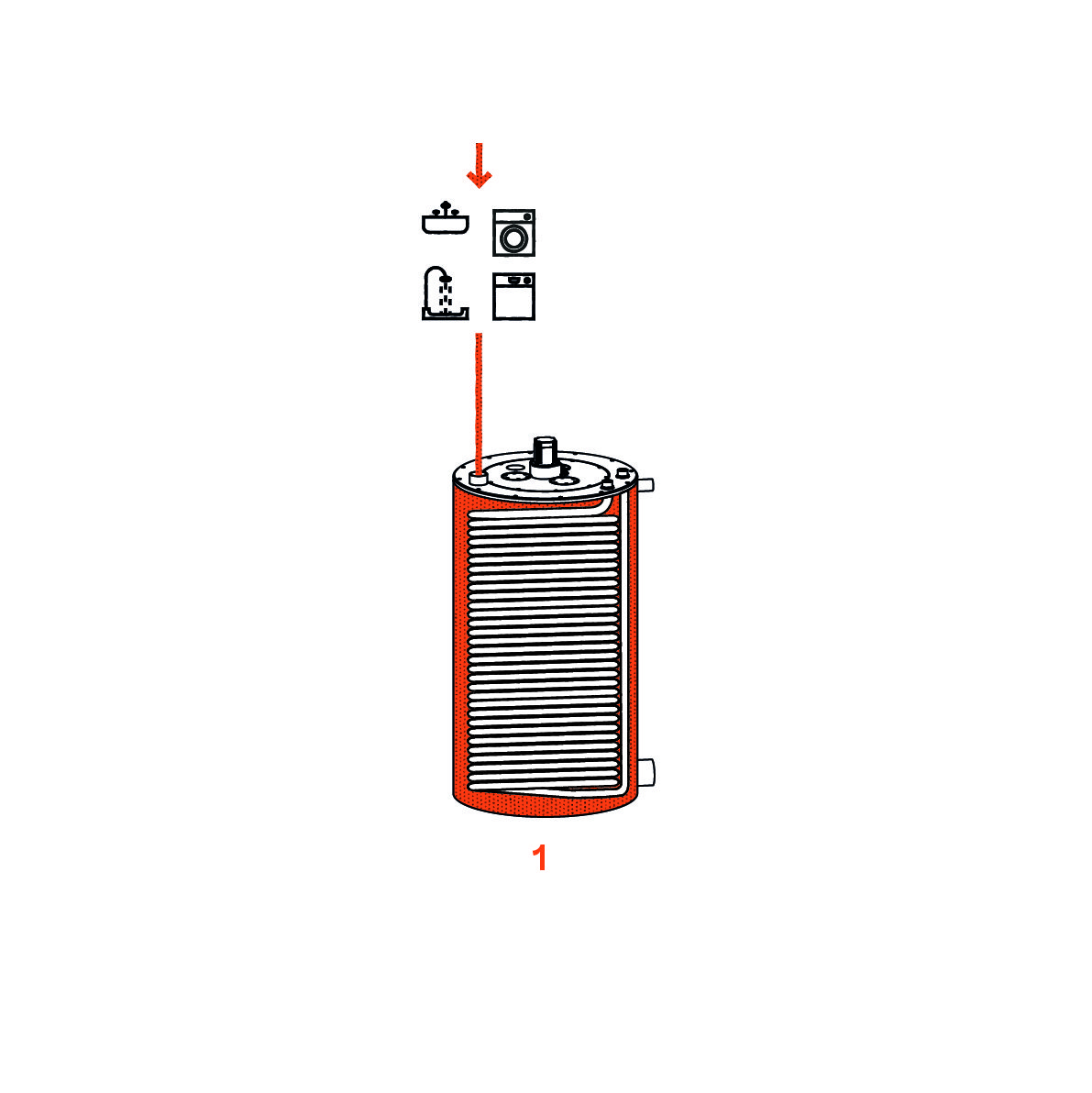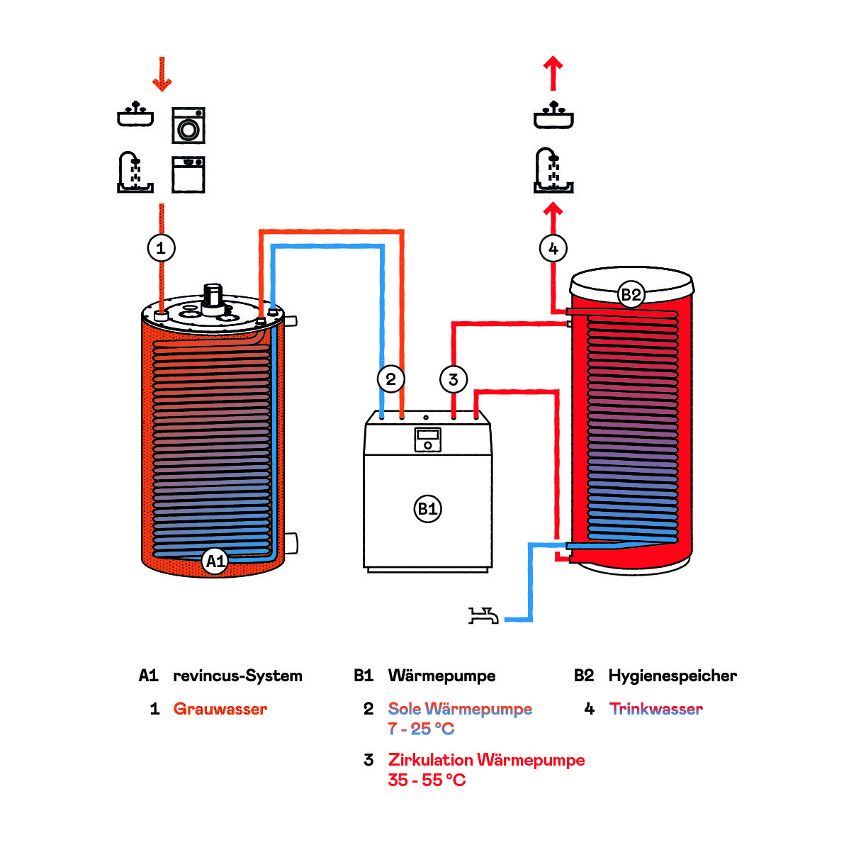 1The revincus wastewater heat exchanger captures the warm greywater directly at the downpipe of the house.